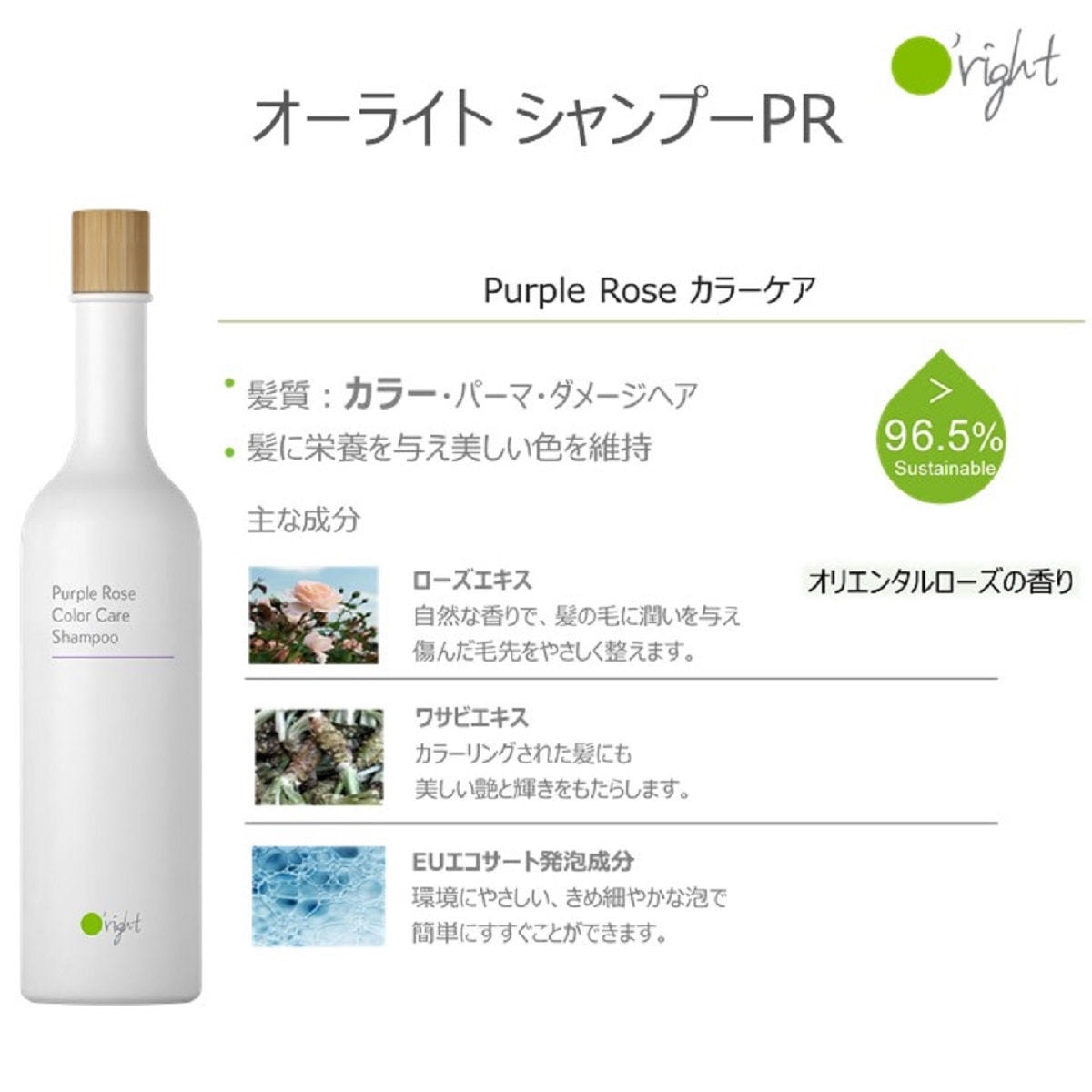 オーガニック認証機関による認定を 取得した発泡成分とパープルローズをイメージしたローズエキス(ダマスクバラ花エキス)が髪に栄養を与え、ワサビエキス(乳酸桿菌/ワサビ根発酵エキス)が美しいヘアカラーをケアし、シルクのようになめらかなツヤ髪へ導にきます。